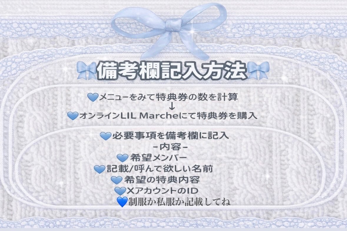 下記を参考に必ずご希望される特典内容を『備考欄』へご記入ください。